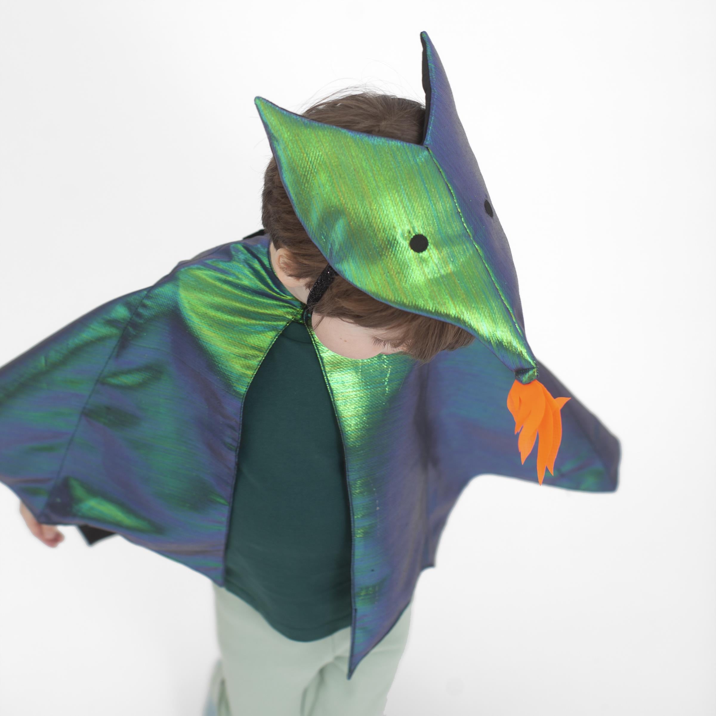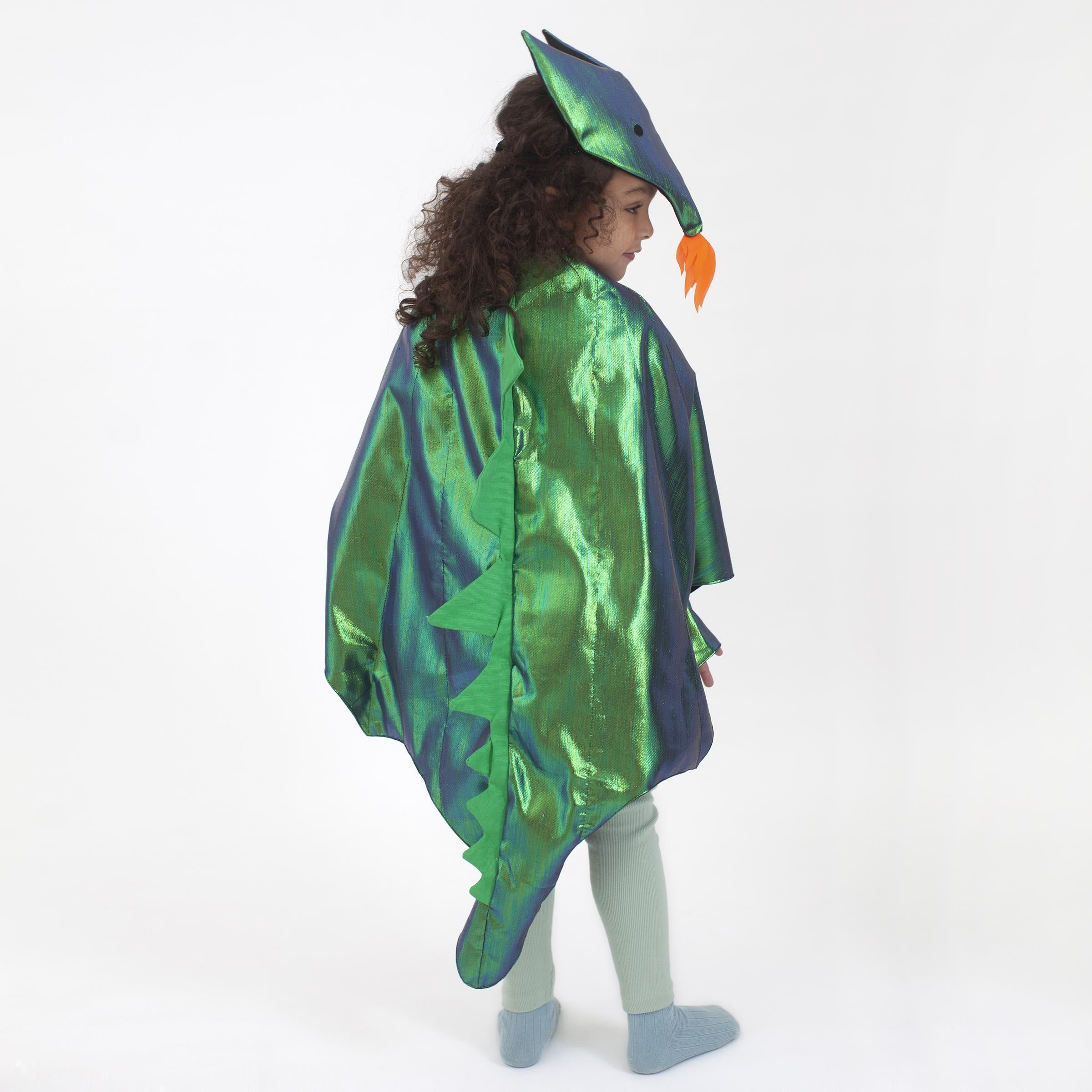 This enchanting ensemble by British brand Meri Meri includes a lustrous green lamé cape with spikes running down the spine, complemented by sparkly black glitter wristbands.