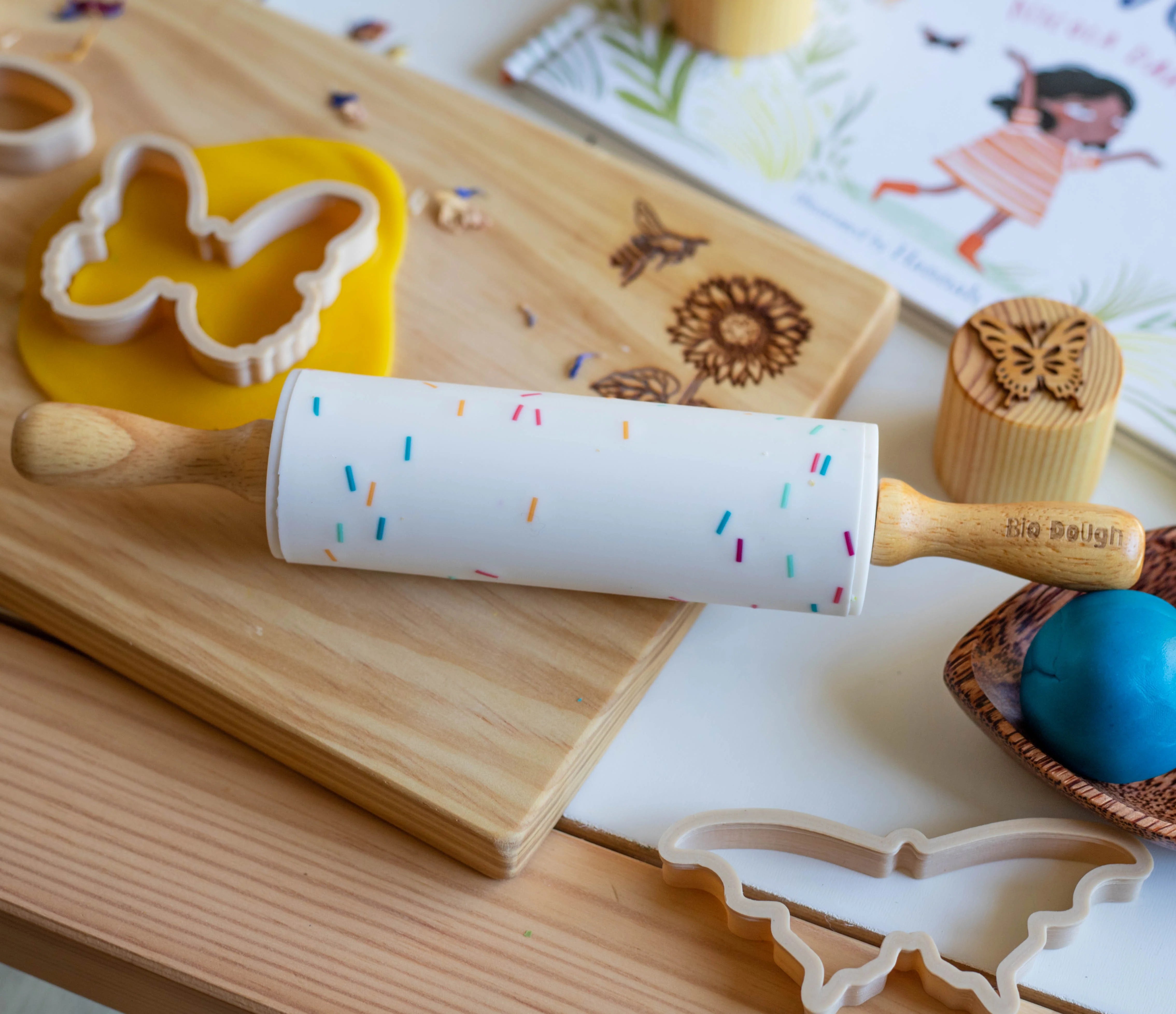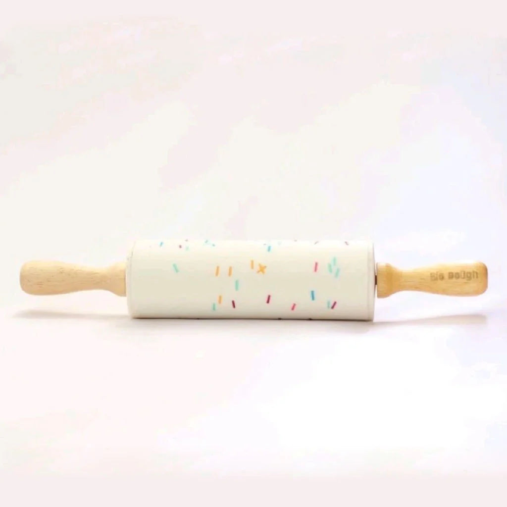 Our high-end silicone rolling pin, featuring a fun confetti design and smooth wooden handles, is perfect for little hands to roll and shape their Bio DoUgh creations with ease.
