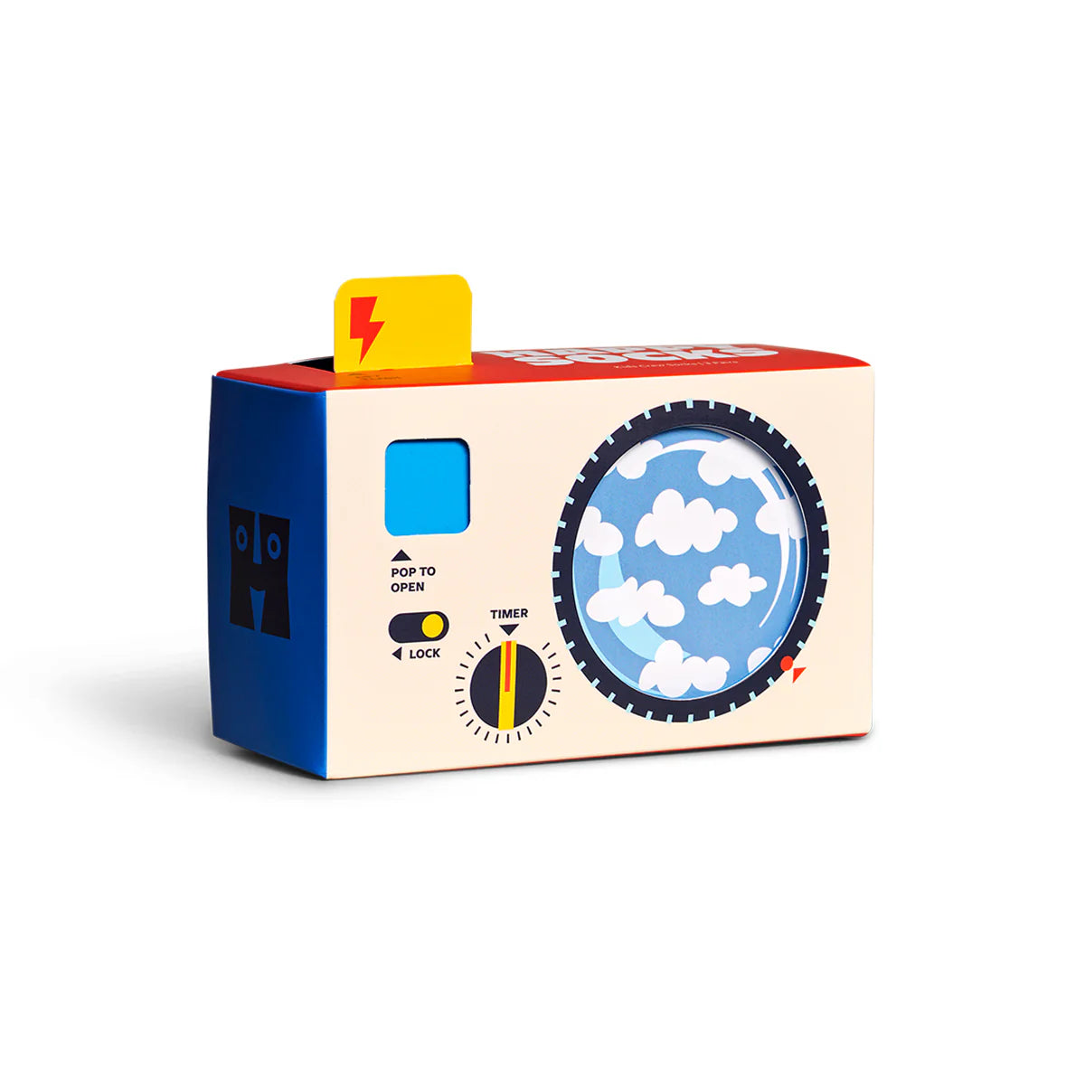 Lights, camera, action! This box can be used as a toy camera once the socks are on the kids' feet. Featuring cloud socks, road trip socks and snail socks.