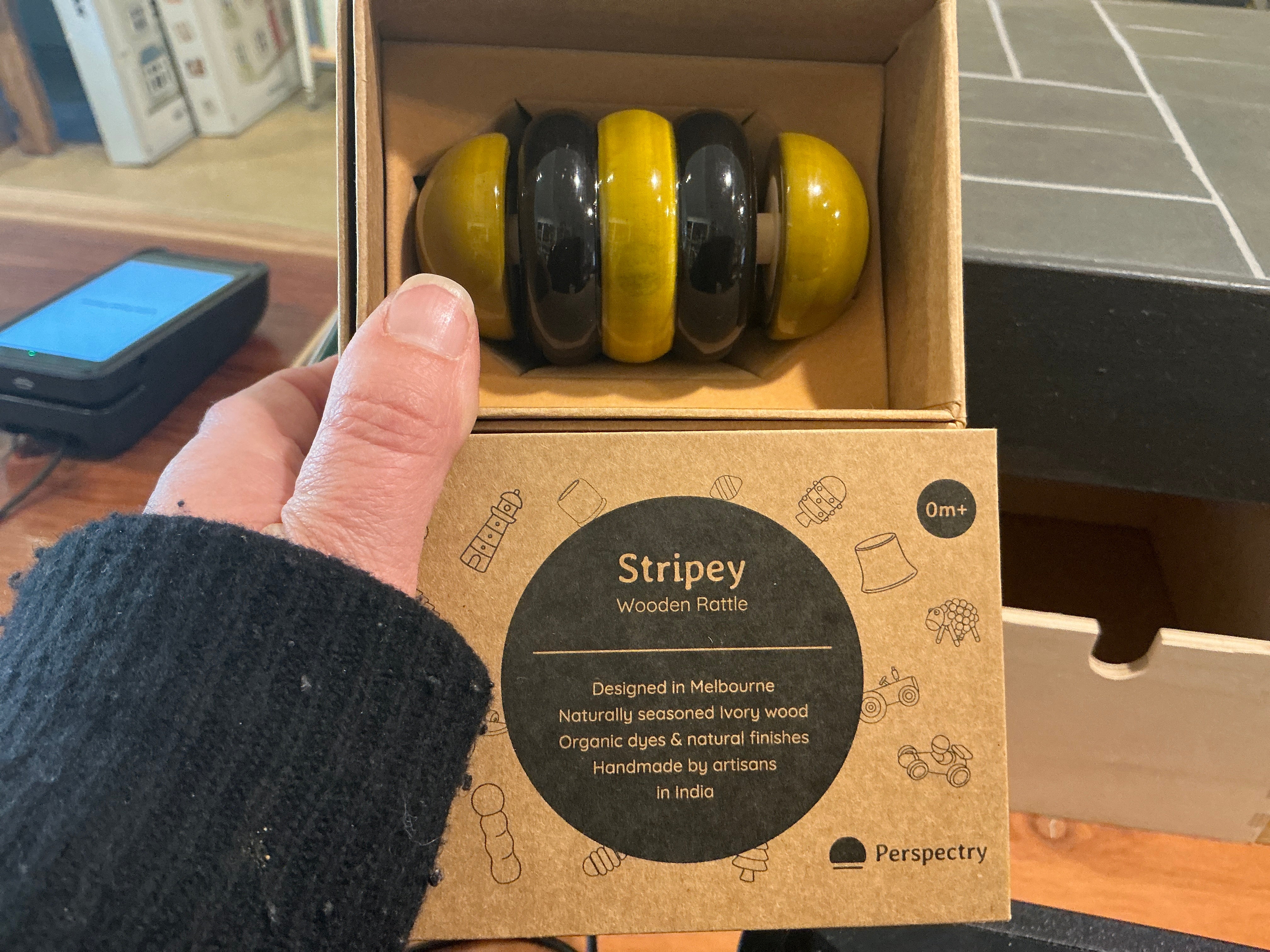 The Stripey Wooden Rattle is crafted from naturally seasoned ivory wood and colored with organic dyes, offering a safe and eco-friendly playtime for infants. Designed in Melbourne and handmade by artisans in India, this rattle combines traditional craftsmanship with modern design. Perfect for newborns, it provides soothing sounds and vibrant colors to stimulate your baby's senses.