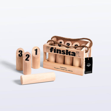 Original Finska is crafted from eco-friendly birch and comes with everything you need to become yet another Finska tragic! This set includes a birch carry crate, 12 numbered pins, one Finska throwing log plus a score sheet and rule card.