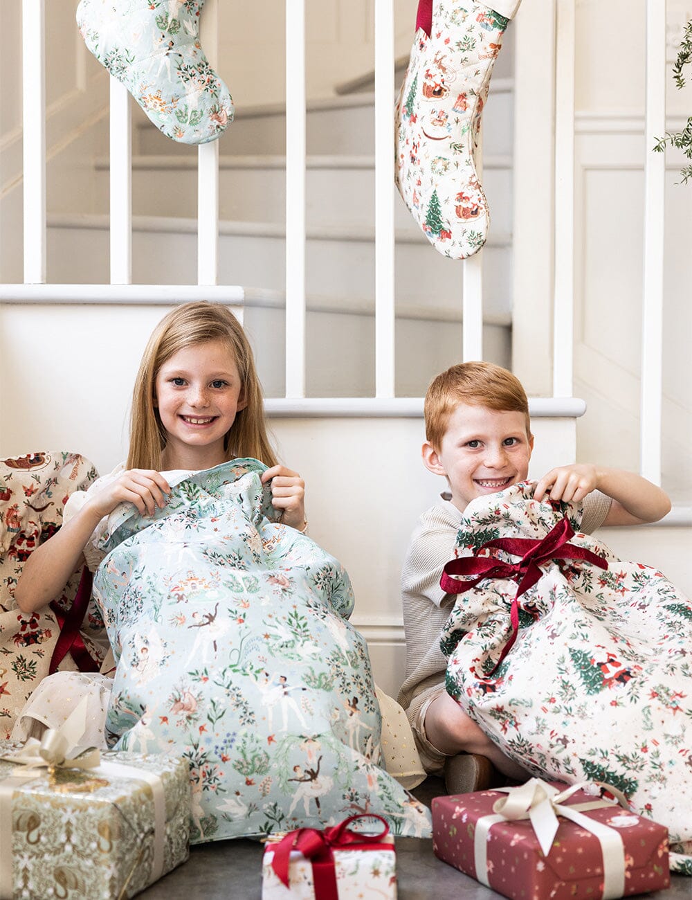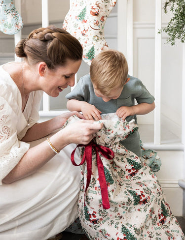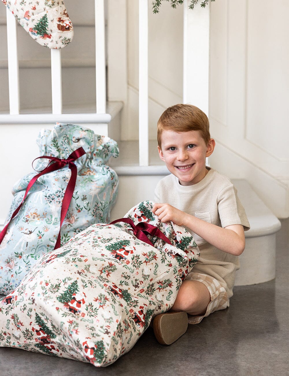Illustrations by Meghann Rader and printed on 100% Linen. Our Heirloom Christmas Santa Sack is printed on the exterior and has luxurious Red Velvet ribbon self. Supplied with a gold foil printed removable swing tag.