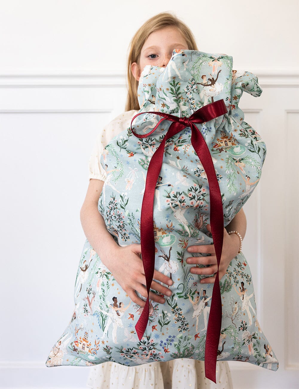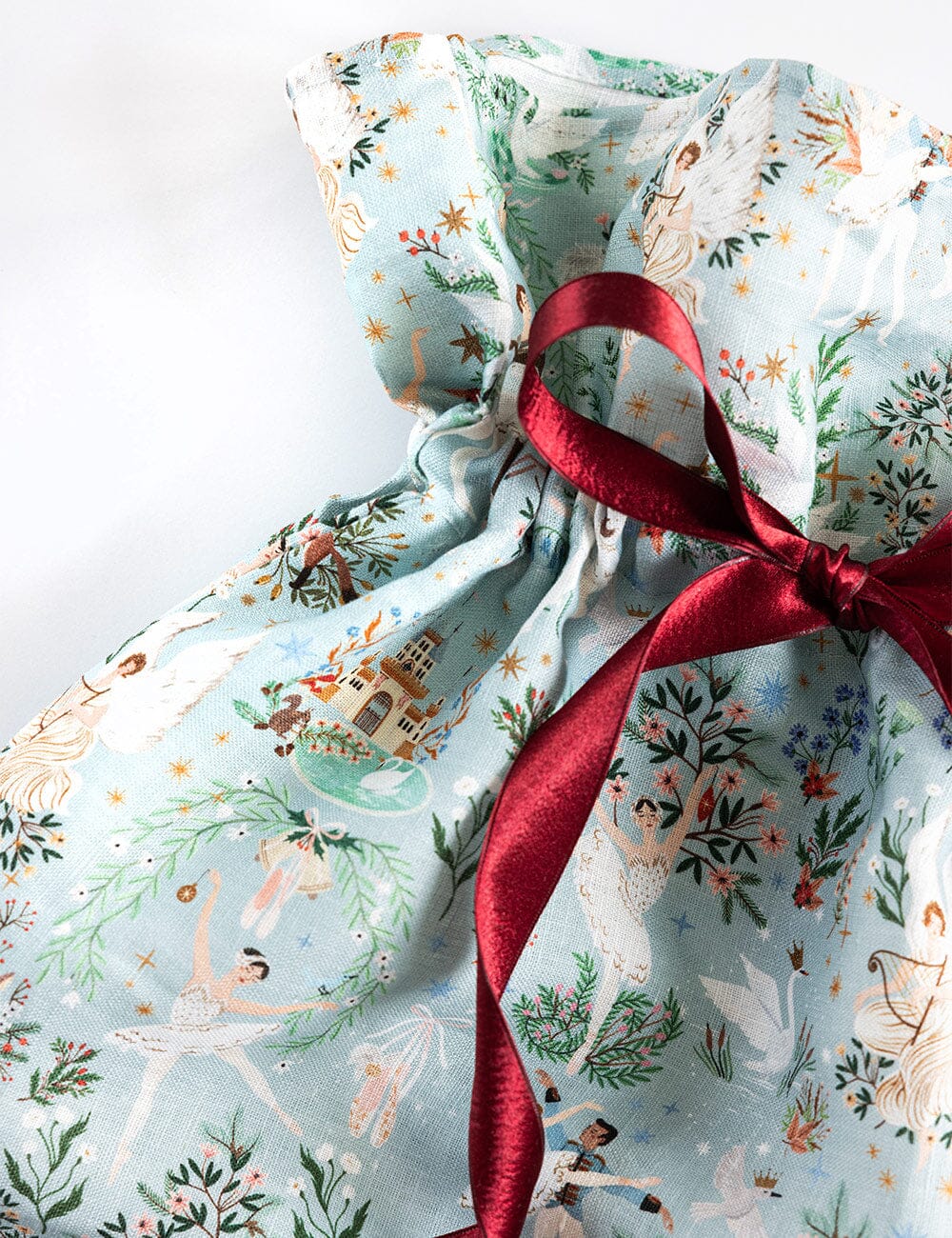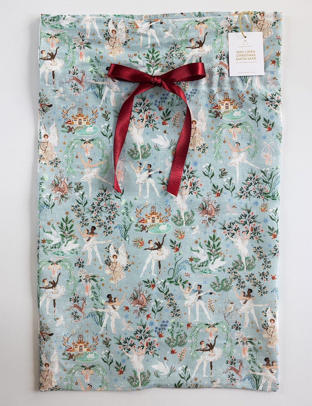 Illustrations by Meghann Rader and printed on 100% Linen. Our Heirloom Christmas Santa Sack is printed on the exterior and has luxurious Red Velvet ribbon self. Supplied with a gold foil printed removable swing tag.