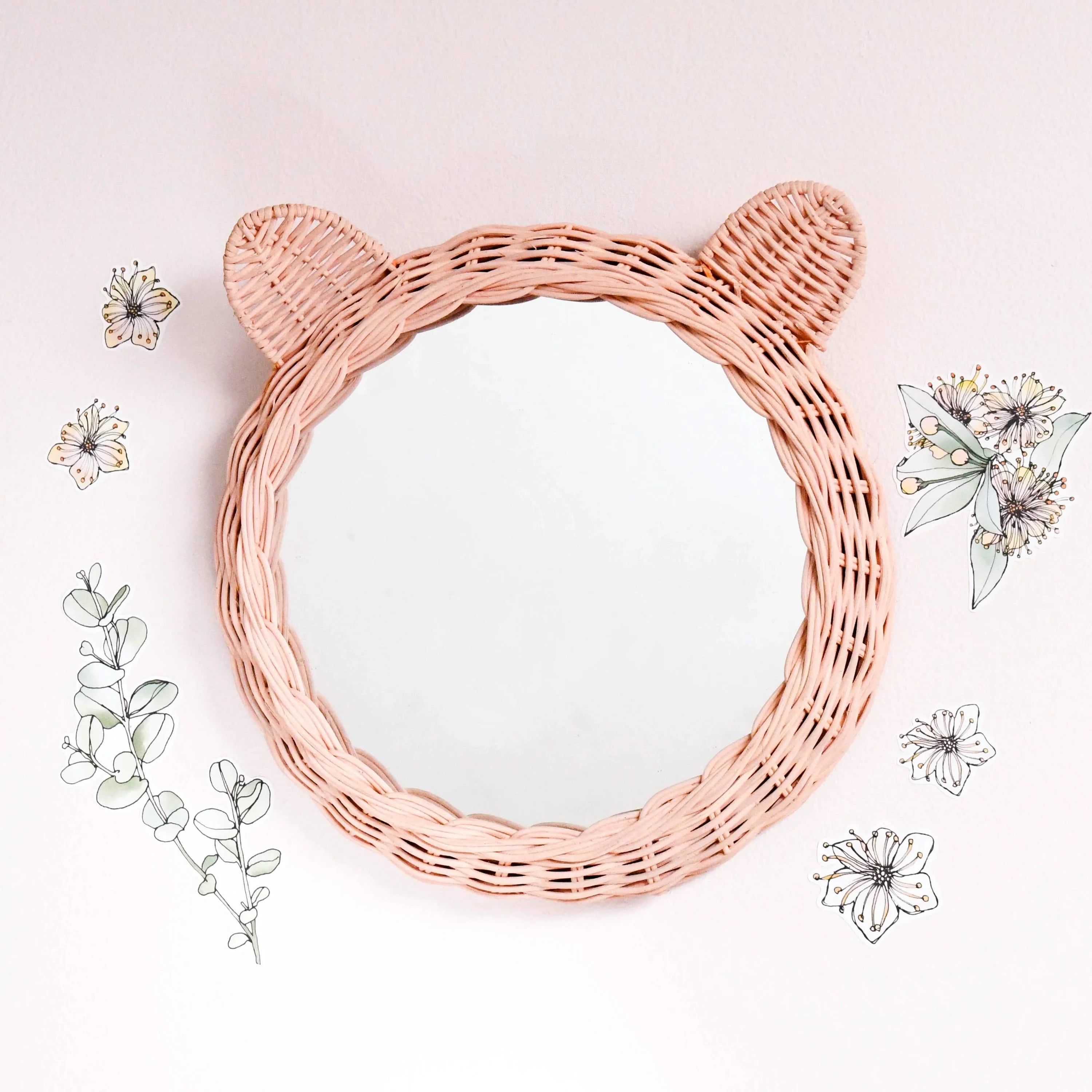 This blush pink bear mirror with cute little ears is a beautiful addition to any living space.