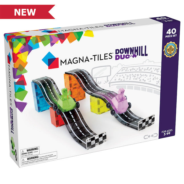 Fuel your child's creativity with the Magna-Tiles Downhill Duo, a 40-piece magnetic construction set. Perfect for developing motor skills and enhancing STEAM learning, this set from the Building Toys category offers endless imaginative play with its unique magnetic ramps, roads, and figures.