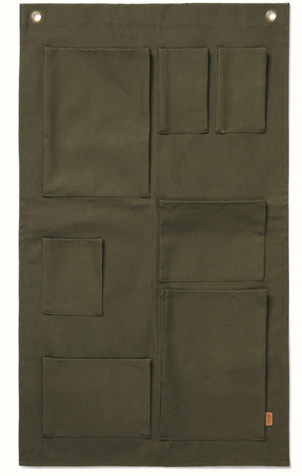 This playful organiser features asymmetrical pockets in just-right sizes, crafted from waxed GOTS-certified organic cotton in a soothing olive tone.