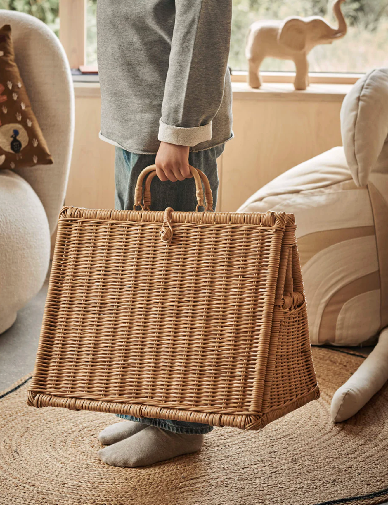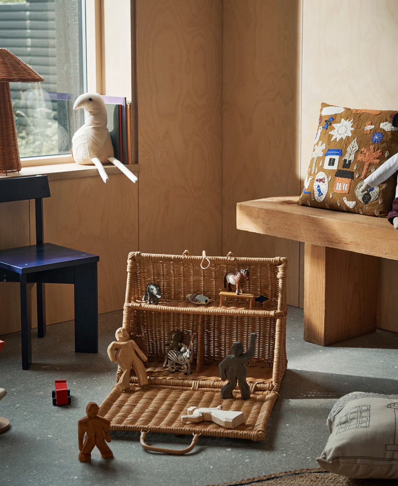 Intriguing for the youngest architecture fans, the Braided A-House is based on the characteristics of an archetype A-house. The house is made from braided rattan and functions as a small dollhouse with a door leading inside and little rooms to decorate. When closed, the braided house can be carried as a bag that will help your little one transport their toys from one fairytale adventure to the next.