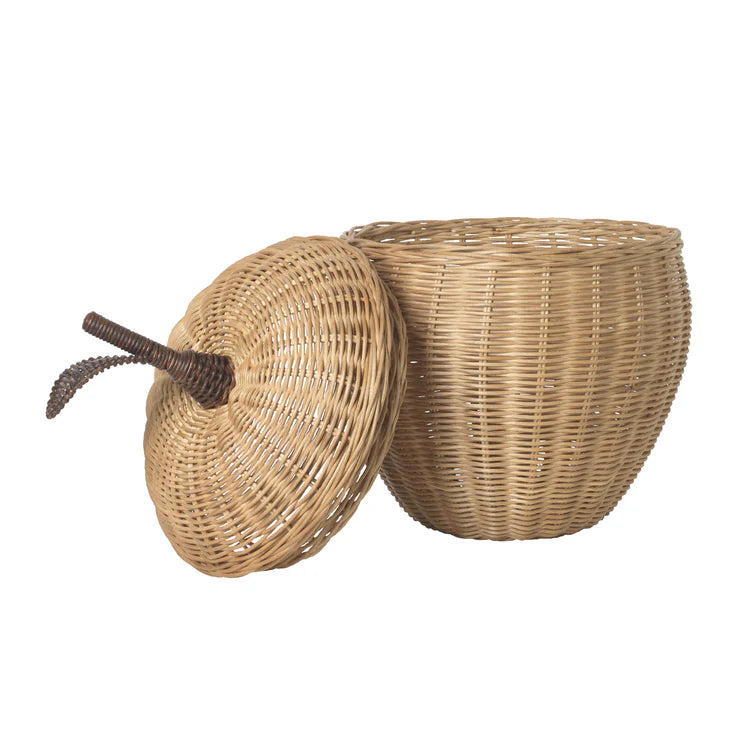 Introduce a touch of whimsy to your child's room with the Ferm Living Apple Braided Storage Basket. This delightful storage solution is not only utilitarian but serves as an enchanting decorative element as well. Carefully crafted from natural rattan, its distinctive apple shape instantly adds a touch of nature and warmth to any setting.