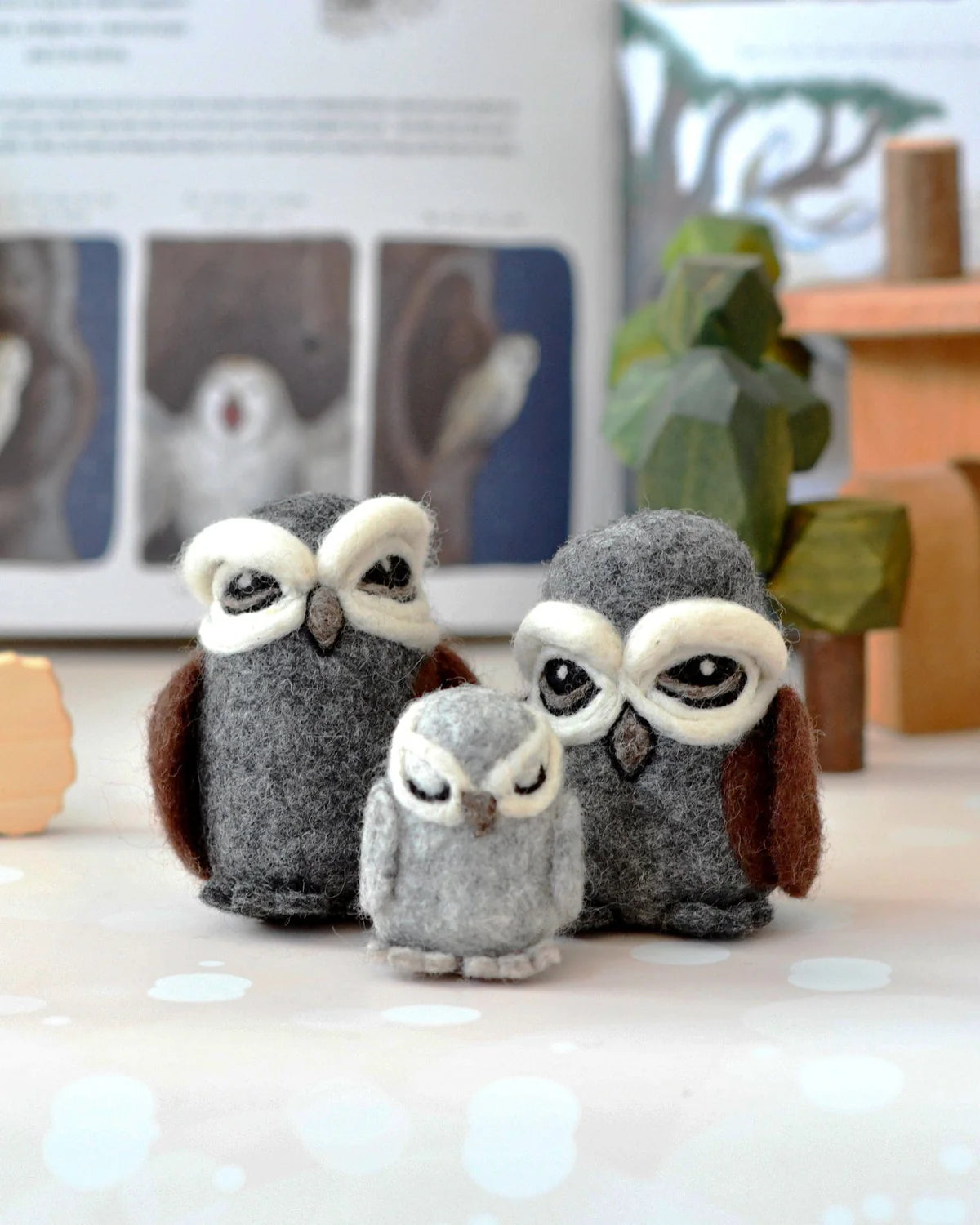 Enhance your home decor with this charming set of three felted wool owls. Each owl features intricate hand-crafted details, capturing a whimsical woodland charm. Perfect for adding a touch of nature-inspired elegance to any space.