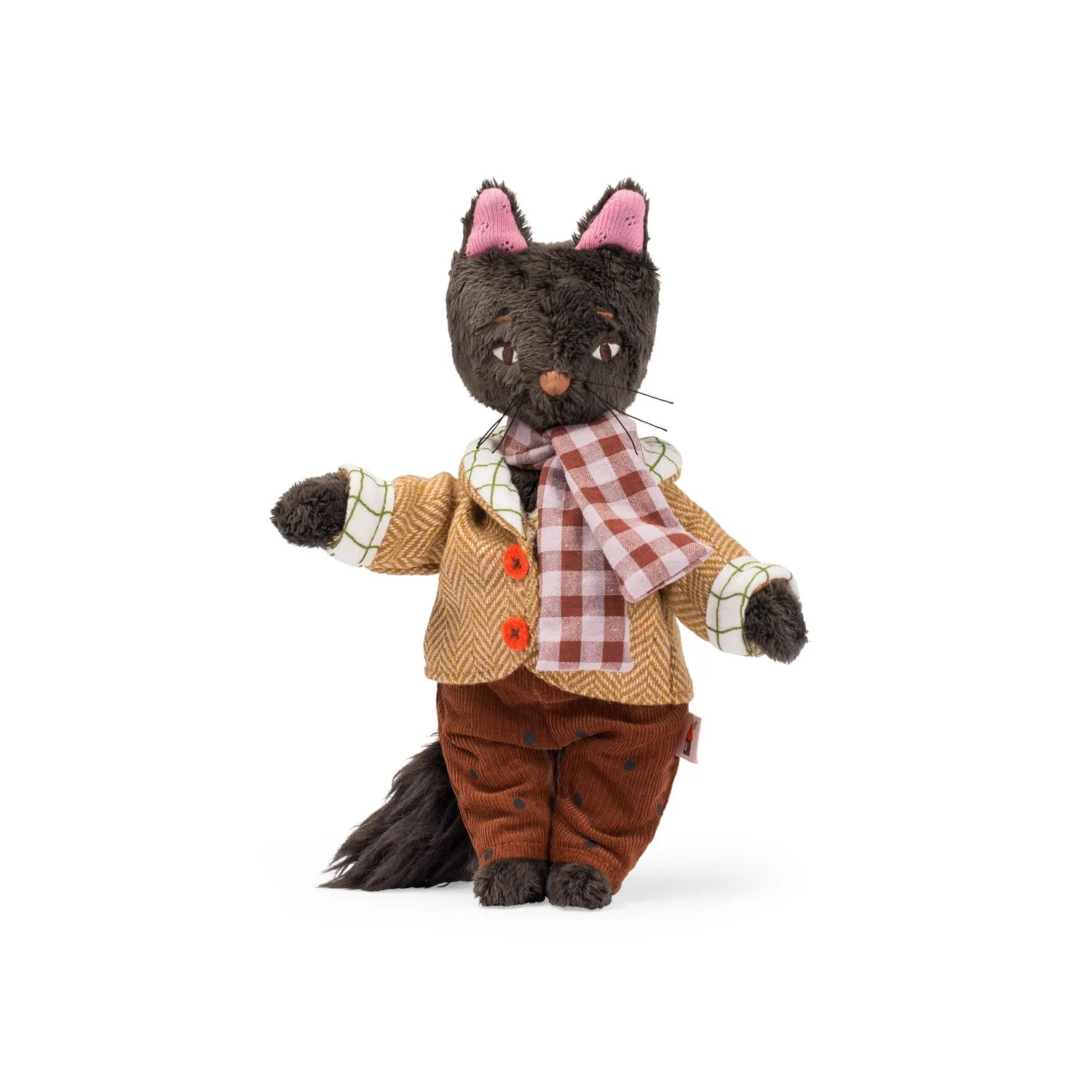 Leon the cat, an elegant scientist and philosopher! Made of super soft fur, with a gorgeous tail, Leon is dressed in a tweed jacket & corduroy pants, and a checked scarf to finish his outfit.