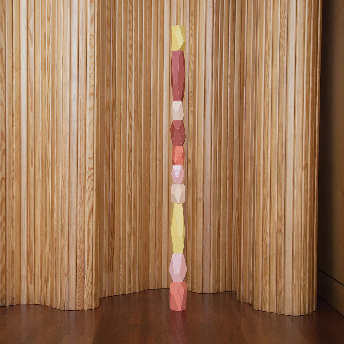 Balance these ten faceted stone-size shapes to create your own sculpture. Tumbled in a water-based paint, and packaged in a cotton drawstring bag.
