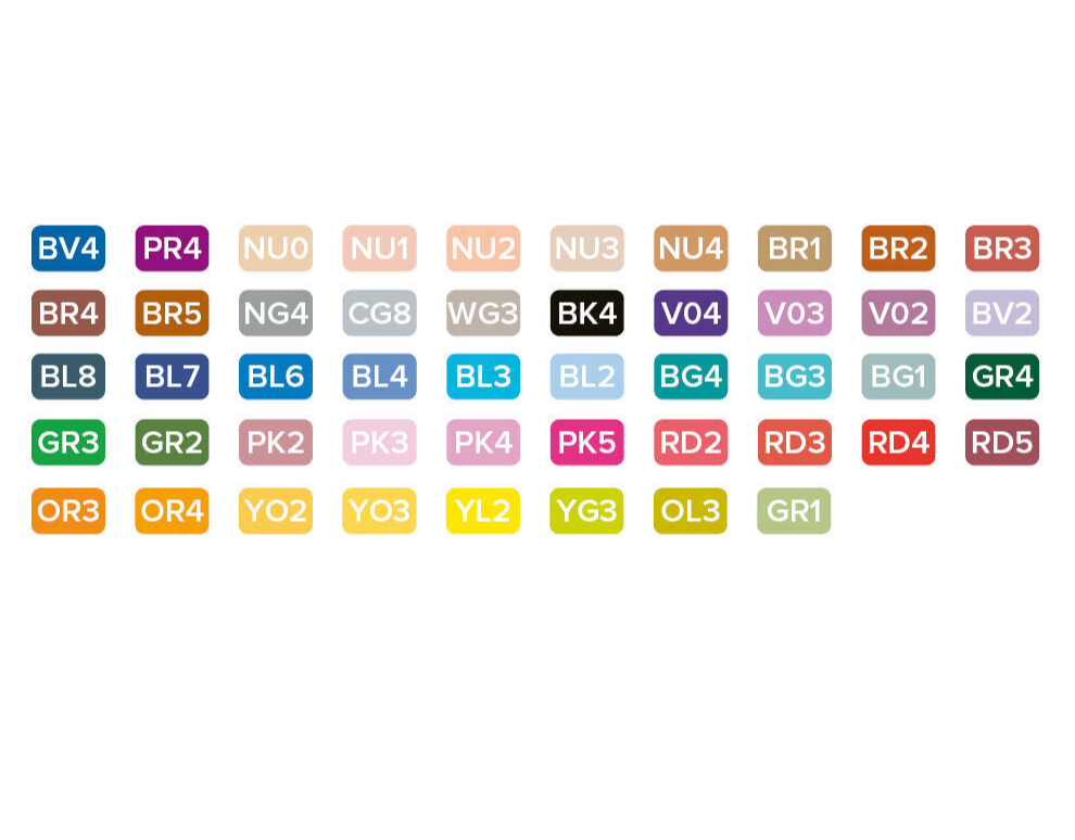 This set contains one pen each of Dusty Rose, Bubble Gum, Peony Pink, Fuchsia, Red Coral, Vermillion, Crimson Red, Burgundy, Tangerine, Seville Orange, Mellow Yellow, Warm Sunset, Summer Sun, Spring Meadow, Olive Green, Green Apple, Dark Sage, Grass Green, Evergreen, Lagoon, Turquoise, Aqua Marine, Baby Blue, Sky Blue, Cornflower Blue, Royal Blue, Indigo, Slate Blue, Lavender, Mauve, Plum, Deep Violet, Blue Violet, Purple Grape, Sand, Bisque, Light Peach, Fawn, Caramel, Taupe, Hot Cocoa, Cinnamon, Burnt Umber, Bark, Neutral Grey, Cool grey, Warm Grey and Deep Black.