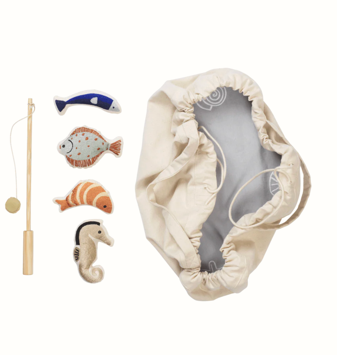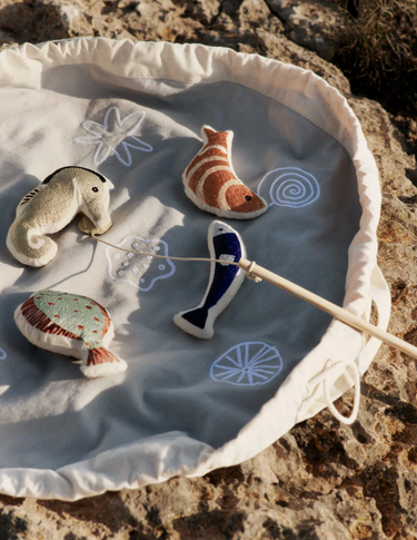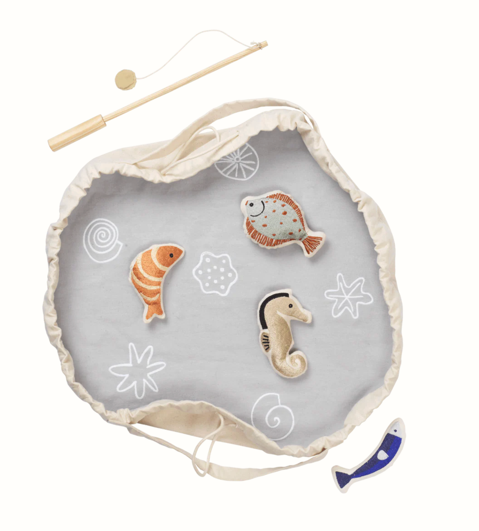 The Fishing Game is a charming and engaging addition to your little one's playtime collection. It features plush fish filled with recycled polyester, a fishing rod, and vibrant embroidered designs with magnetic features. The organic cotton mat transforms into a practical drawstring bag with sea-themed embroidery and handles for easy portability.