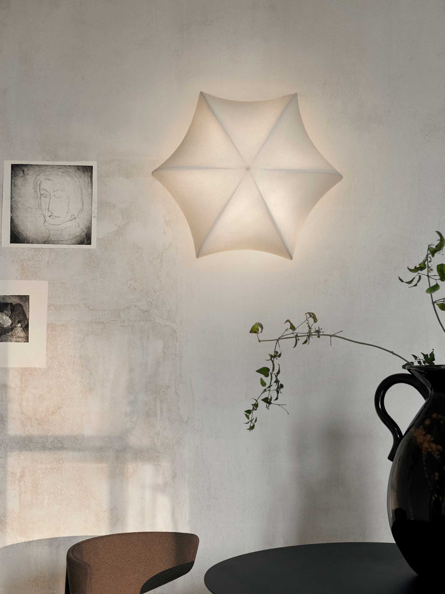Drawing inspiration from the opulent details found in Baroque art and architecture, the Poem Wall/Ceiling Lamp has a romantic and elegant expression. Made through an intricate process where liquid tissue is sprayed over the lamp's inner steel structure, the result is a translucent shade that artfully stretches over intricate arches, ensuring that the lamp emits a soft, diffused light while resembling a delicate flower. The non-woven polymer shade will beautifully patinate over time, giving it a unique appearance. Hang the Poem lamp on a wall or use it as a plafond-style ceiling lamp that will elevate and illuminate any space.