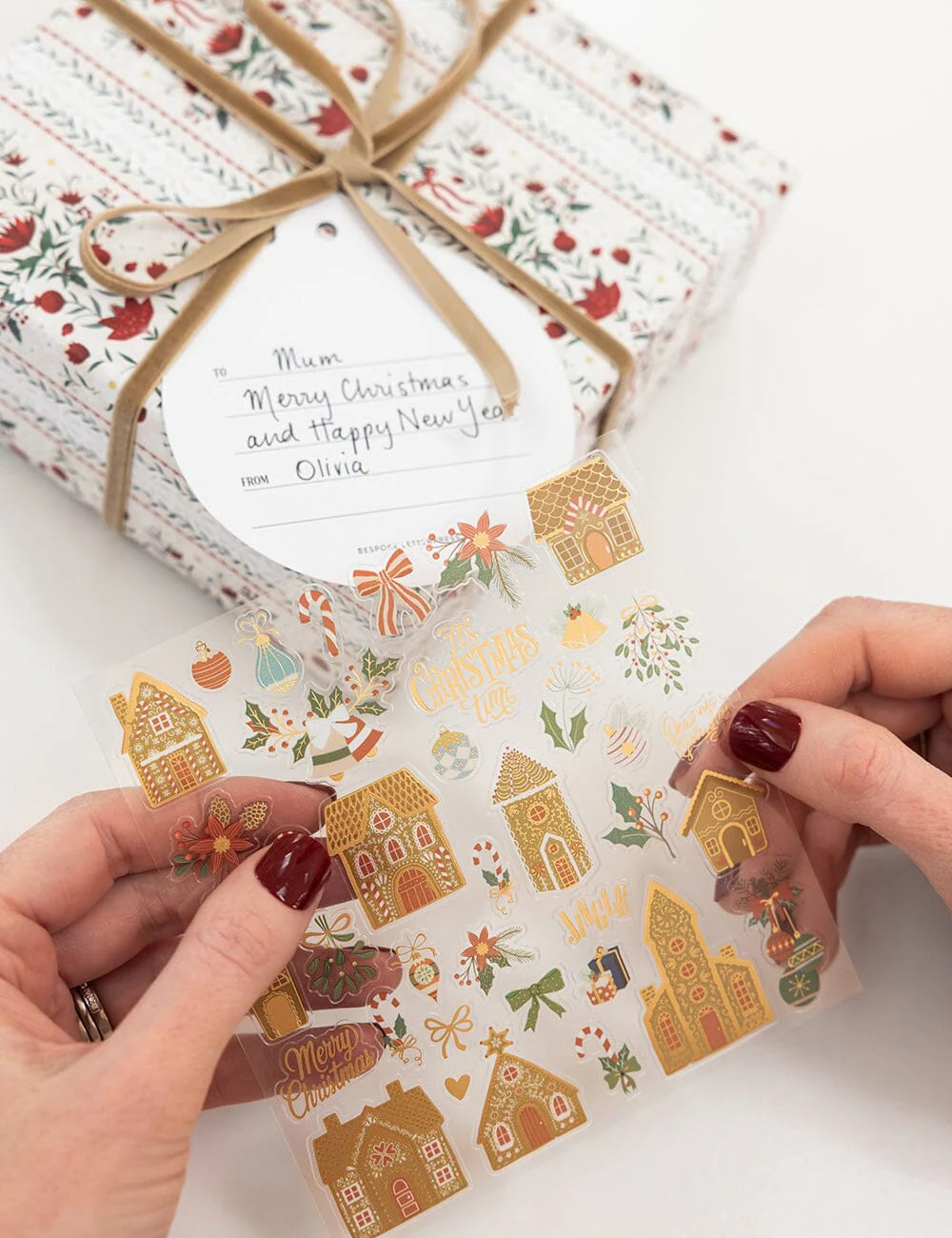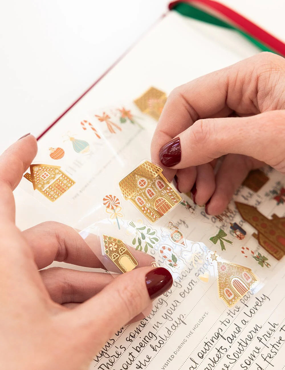 "Gingerbread Houses" gold foil accented sticker sheets are designed to bring festive charm and joy to your holiday celebrations. Whether you're decorating gift wrap, sending heartfelt cards, or adding holiday cheer to your journal, these stickers add a touch of elegance and warmth to every detail.