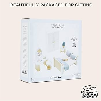 A painted wooden bedroom set that features a classic design in lovely neutral tones. Compatible with all of the Le Toy Van wooden dolls houses. Crafted from FSC™ certified wood, a restful night’s sleep beckons thanks to the comfy double bed, complete with cosy quilt and squishy pillows - all topped off with a stylish throw and wooden tray for serving up delicious breakfast’s in bed. There’s also a smart wardrobe with coat hangers, a bedside table with lamp, plus, a gorgeous dressing table, stool and accessories for acting out petit pampering sessions. Dimensions: Wardrobe - 10.5cm x 5.8cm x 14.8cm