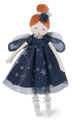 Adorned in a starry midnight blue dress with fairy wings and ballet slippers, she's perfect for magical adventures. Céleste the fairy has a delicate embroidered and silkscreen printed face, and is dressed and ready for the show. Her midnight blue dress is trimmed with glittery tulle featuring stars and little fairy wings, whilst her ballerina slippers are fastened with satin ribbon laces.