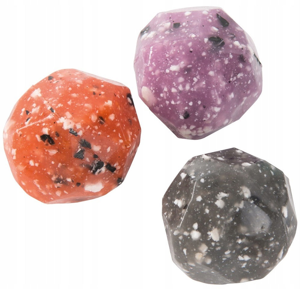 This set includes three uniquely shaped, mineral-like rubber balls that mimic precious stones, perfect for endless fun.