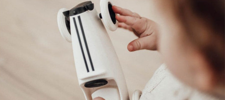 Body: composite of renewable raw materials (spruce fibres) and plastic; Tyres: rubber. The car is not made with harsh paints or glues. It is not battery operated, nor does it contain BPA, PVC, or phthalates.